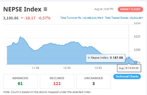 काठमाडौं । साताको अन्तिम दिन नेप्से १८ दशमलव १७ अंकले घटेर ३१८१ दशमलव ८६ दशमलव १६ विन्दुमा कायम भएको छ।