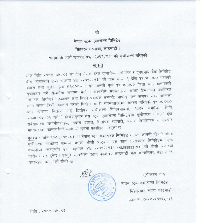 काठमाडौं । नेपाल स्टक एक्सचेन्ज (नेप्से) मा “एनएमबि उर्जा ऋणपत्र अन्तर्गको २ वटा ऋणपत्र सूचिकृत भएको छ ।नेप्सेमा आज “एनएमबि उर्जा ऋणपत्र ४%–२०९२“ र एनएमबि उर्जा ऋणपत्र ८.५ को ३५ लाख कित्ता ऋणपत्र सूचिकृत भएको हो ।