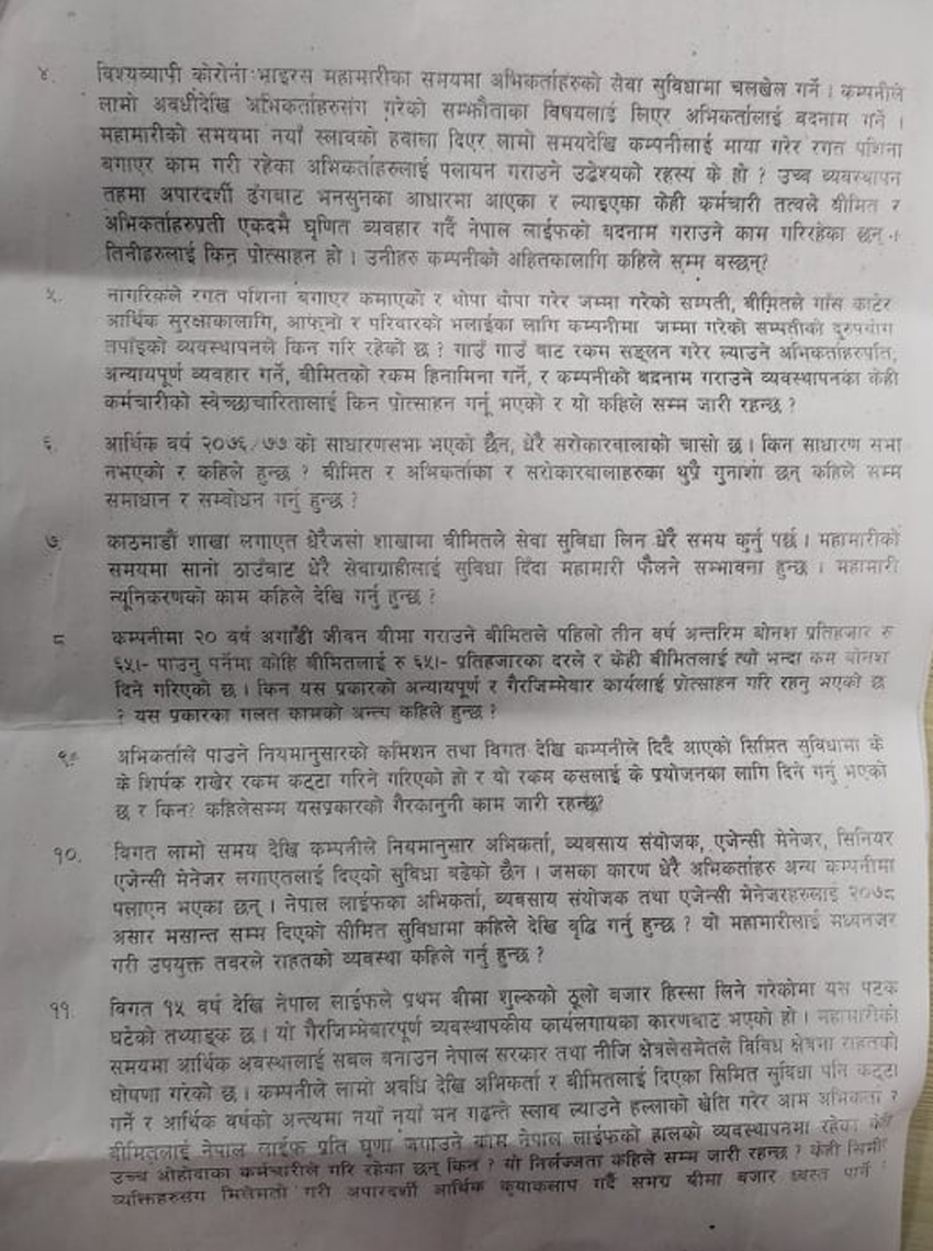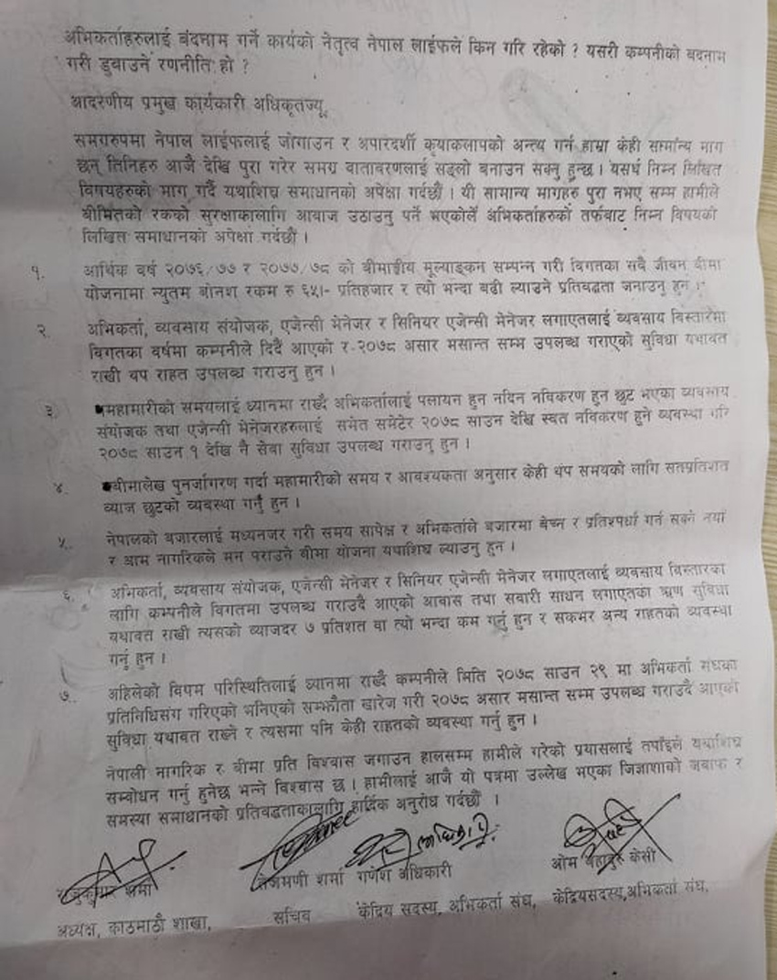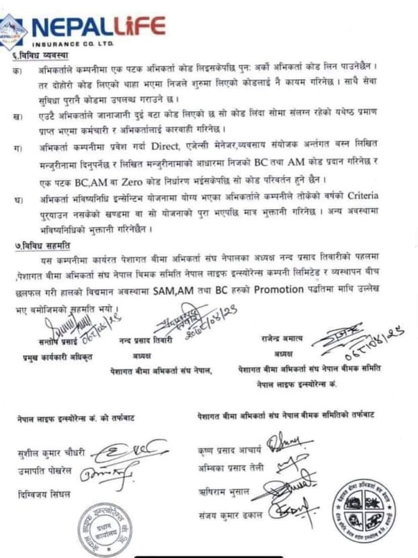 नेपाल लाइफमा अभिकर्तासँग पैसा उठाएर खाने अभिकर्ता संघका अध्यक्ष सहितका पदाधिकारीहरुले किन हस्ताक्षर गरेका रैछन जवाफ देऊ । बीमा अभिकर्ताको कोर्डबाट कम्पनीसँग मिलेमतो गरी अर्को कोडमा व्यवसाय सार्ने सराउने धन्दा चलाउने संघका अध्यक्ष नन्द तिवारीले पदबाट राजिनामा दिनुपर्छ कि पर्दैन ? तिम्रा नैतिकता कता छ ? बीमा अभिकर्ताहरु पेशागत हक अधिकार सुनिश्चित गर्न एकताबद्ध छन् ।