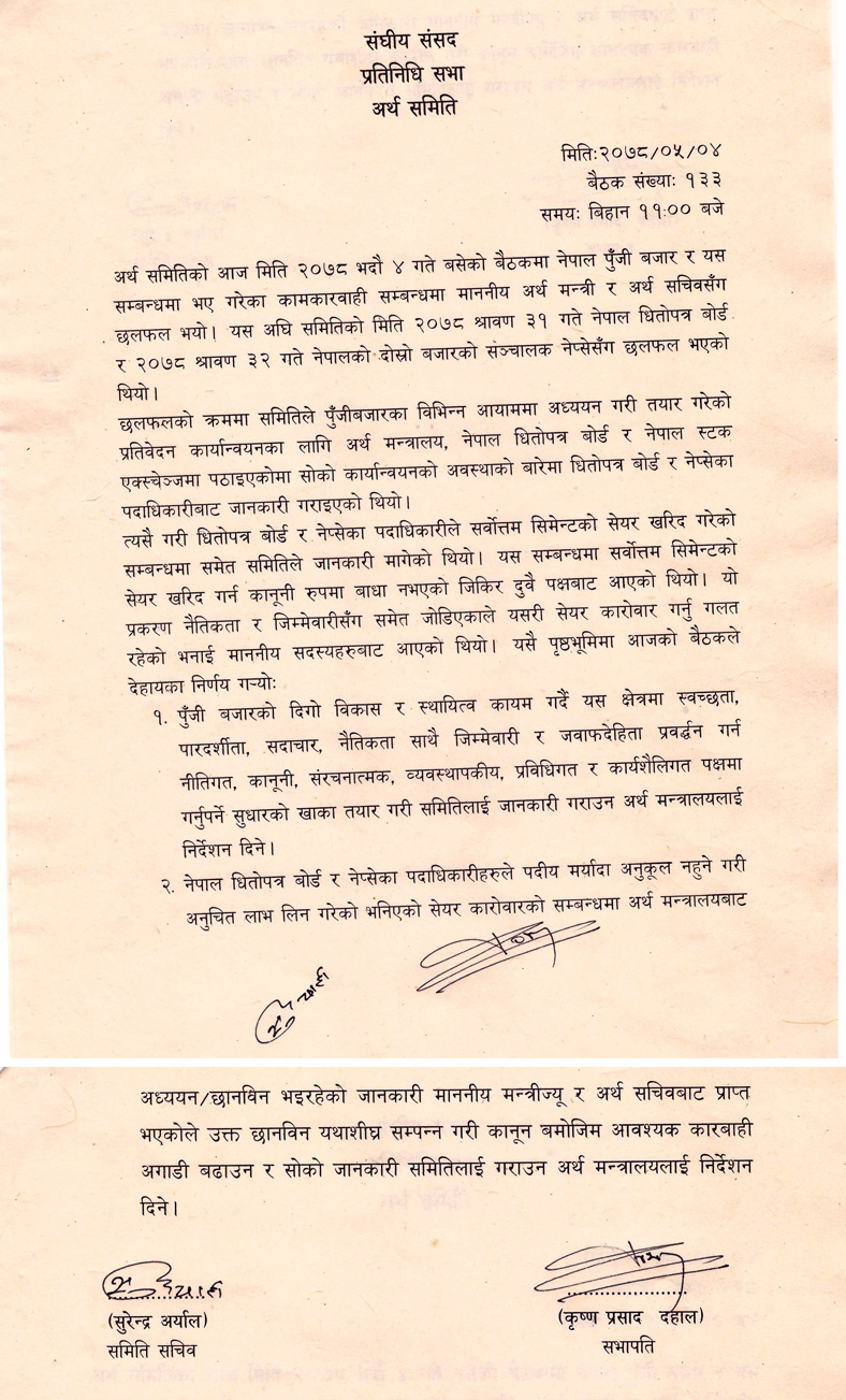 आज बसेको अर्थ समितिको बैठकले बोर्ड अध्यक्ष ढुंगाना र नेप्सेका कार्यकारी साउदलाई अध्ययन अनुसन्धान पश्चात कानुन बमोजिमको कारवाही गरी सो को जानकारी अर्थ समितिलाई दिन निर्देशन दिने निर्णय गरेको हो ।