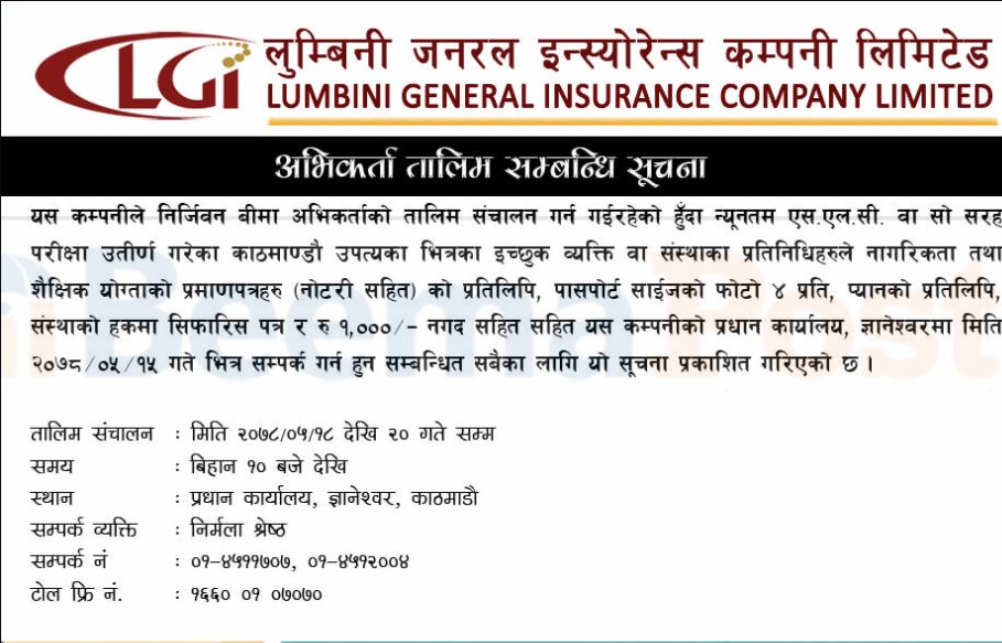काठमाडौं । लुम्बिनी जनरल इन्स्योरेन्स कम्पनीले अभिकर्ता तालिम संचालन गर्ने भएको छ। कम्पनीले न्यूनतम एसएलसी वा सो सरह परिक्षा उत्तीर्ण गरेका काठमाडौं उपत्यका भित्रका इच्छुक व्यक्तिलाई आवेदन दिन आग्रह गरेको छ।