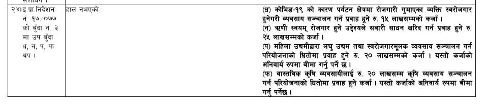 नेपाल राष्ट्र बैंकले जारी गरेको एकीकृत निर्देशिकाको २४ नं बुँदामा परियोजनाको अनिवार्य रुपमा बीमा गर्ने उल्लेख गरिएको छ । उल्लेखित बुँदामा यस अघि नभएकोमा उप बुँदा प र फ थप गरी सो व्यवस्था गरिएको हो ।