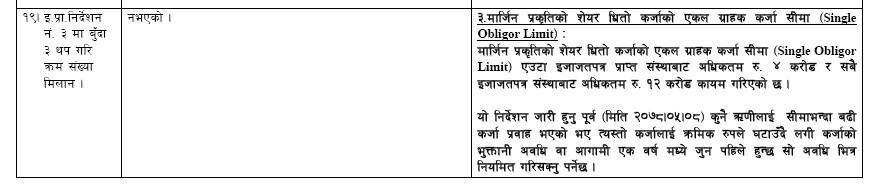 सो व्यवस्था अनुसार अब शेयर कारोबारीहरु ऋण्णको निश्चित सीमाभित्र बस्नुपर्ने भएको छ । यस्तो व्यवस्थाले शेयर बजारका ठूलो खेलाडीहरुले एउटै व्यक्तिको नाममा करोड रुपैयाँ ऋण लिएर शेयर कारोबार गर्न नपाउने भएका छन् । अनुत्पादक क्षेत्रमा बैंकको लगानी नियन्त्रण गर्ने उद्देश्यले अघि बढाइएको यस्तो योजनाले लगानीकर्ताहरुलाई खासै फरक पार्ने छैन । ठूला खेलाडीहरुले आफूले मात्रै शेयर कारोबार नगर्ने, विभिन्न व्यक्तिका नाममा शेयर कारोबार गर्ने हुँदा ऋण समेत अन्य व्यक्तिका नाममा लिन समस्या नहुने र बैंकहरुसँग सजिलै सेटिङ गर्ने हुँदा एकीकृत निर्देशिकाले शेयर कारोबार खासै प्रभावित होला जस्ता देखिदैन ।