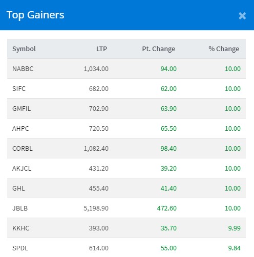 आज नाराणनी डेभलपमेन्ट बैंक, श्री इन्भेष्टमेन्ट फाइनान्स, गुहेशोवरी मर्चेन्ट बैंक, अरुण भ्याली हाईड्रोपावर डेभलपमेन्ट, कर्पोरट डेभलपमेन्ट बैंक, आँखु खोला परियोजना, घलेम्दी हाईड्रो र जीवन विकास लघुवित्तको शेयरमा पोजेटिभ सर्किट लागेको छ ।