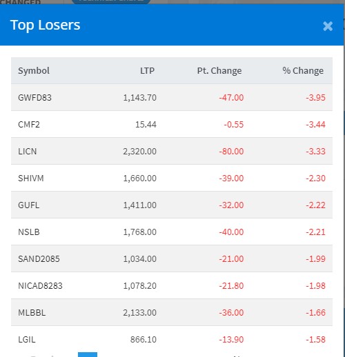 आज गुमाउने कम्पनीहरुमा गुडविल फाइनान्सको ३.९५ प्रतिशत अकं, सिटिजन म्युचुअल फण्डको ३.४४ प्रतिशत अकं, लाइफ इन्स्योरेन्सको ३.३३ प्रतिशत अकं र शिवम् सिमेन्टको २.३० प्रतिशत अकंले घटेको हो ।