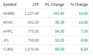 आज नारायणी डेभलपमेन्ट बैंक र खानीखोला हाईड्रोपावरको शेयरमा पोजेटिभ सर्किट लागेर सर्वाधिक कमाउन सफल भएका छन् । साथै अरुण भ्याली हाईड्रोपावरको ७.५६ प्रतिशत अकं, जानकी फाइनान्सको ६.९९ प्रतिशत अकं र सिभिल लघुवित्तको ६.३० प्रतिशत अकंले बृद्धि भएको छ ।