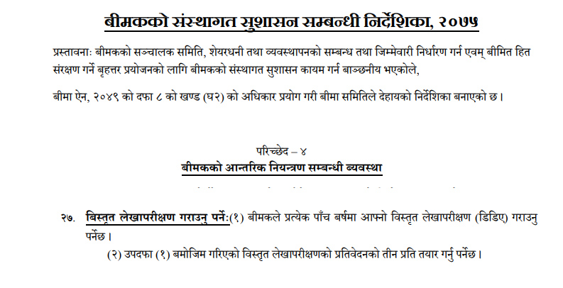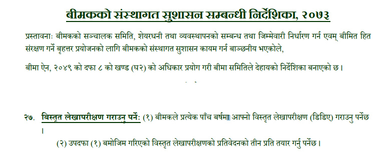 बीमा समितिले २०७३ सालमा जारी गरेको संस्थागत सुशासन सम्बन्धी निर्देशिकामा हरेक पाँच वर्षमा सबै बीमा कम्पनीहरुले विस्तृत लेखा परिक्षण गर्नुपर्ने उल्लेख छ । २०७३ सालमा जारी निर्देशिका अनुसार उतिबेला नै कम्पनीहरुले डिडिए गराउनु पर्ने थियो । कमजोर नियामकको फाइदा उठाउँदै अटेर गर्दै आएका कम्पनीहरुले अहिलेसम्म पनि डिडिए गरेको छैनन् ।