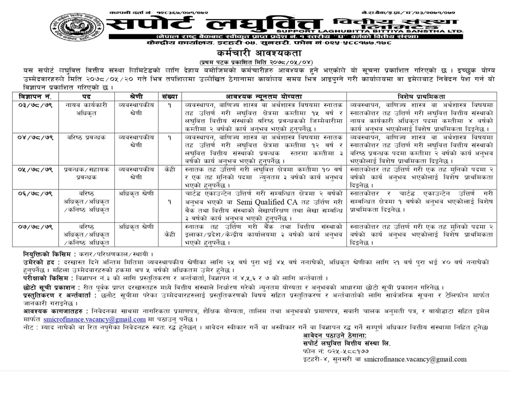 संस्थाले ब्यवस्थापकीय श्रेणी अन्तर्गतको नायब कार्यकारी अधिकृतमा १ जना, वरिष्ठ प्रबन्धकमा १ जना, प्रबन्धक/सहायक प्रबन्धकमा केही सख्यामा कर्मचारी मागेको हो ।