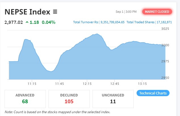 काठमाडौं । साताको चौथो दिन नेप्से परिसूचक झिनो अंकले मात्र बृद्धि भएको छ । आज नेप्से परिसूचक १.१८ अंकले बृद्धि भई २९७७.०२ विन्दु कायम भएको छ ।