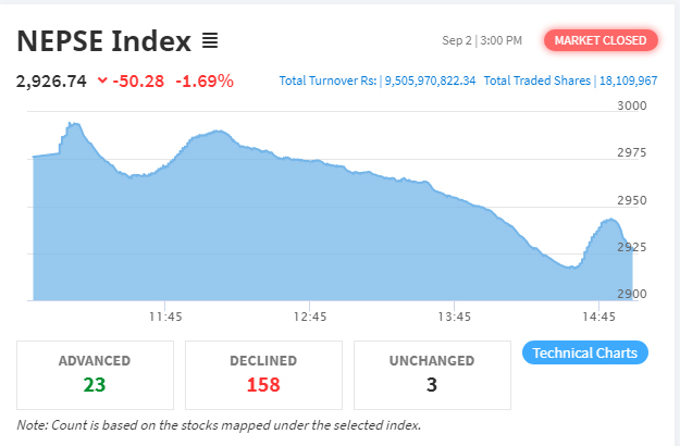 काठमाडौं । साताको कारोबार अन्तिम दिन नेप्सेमा भारि गिरावट आएको छ । नेप्से परिसूचक ५०.२८ अंकले घटेर २९२६.७४ विन्दुमा कायम भएको छ ।