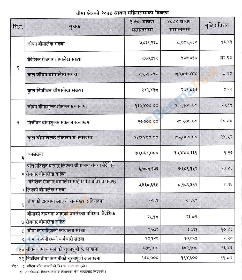 बीमा समितिको तथ्याङ्क अनुसार जीवन बीमा कम्पनीहरुले साउन मसान्तसम्ममा ८५ लाख ८७ हजार ४४ वटा बीमा पोलिसी जारी गर्न सफल भएका छन् । समीक्षा अवधीमा बैदेशिक रोजगार म्यादी बीमा लेखको संख्या ३२.९० प्रतिशतले घटेको छ भने जीवन बीमा पोलिसीको संख्या १३.४३ प्रतिशतले बृद्धि भएको छ ।