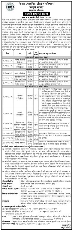 नेपाल प्रशासनिक प्रशिक्षण प्रतिष्ठानले बढुवाद्वारा र आन्तरिक एवं खुल्ला प्रतियोगितात्मक परिक्षाद्वारा पदपूर्ति गर्नेगरी दरखास्त आह्वान गरेको छ ।