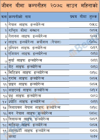 जीवन बीमा कम्पनीहरुको प्रथम बीमाशुल्क आर्जन २ अर्ब ७४ करोड रुपैयाँ, कुनको कति ? (तथ्याङ्क सहित)