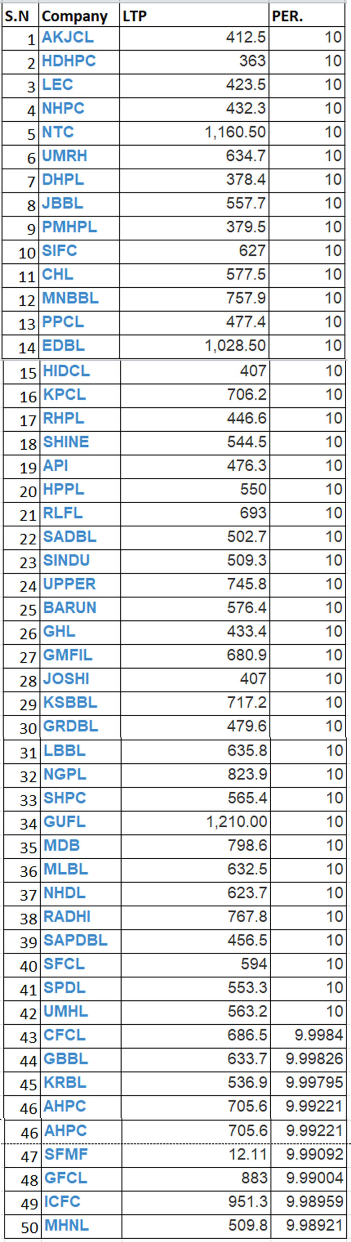 आज एकैदिनमा ५० कम्पनीको शेयरमा लाग्यो सर्किट, यी हुन् अत्याधिक मूल्य बढ्ने कम्पनीको सूचि