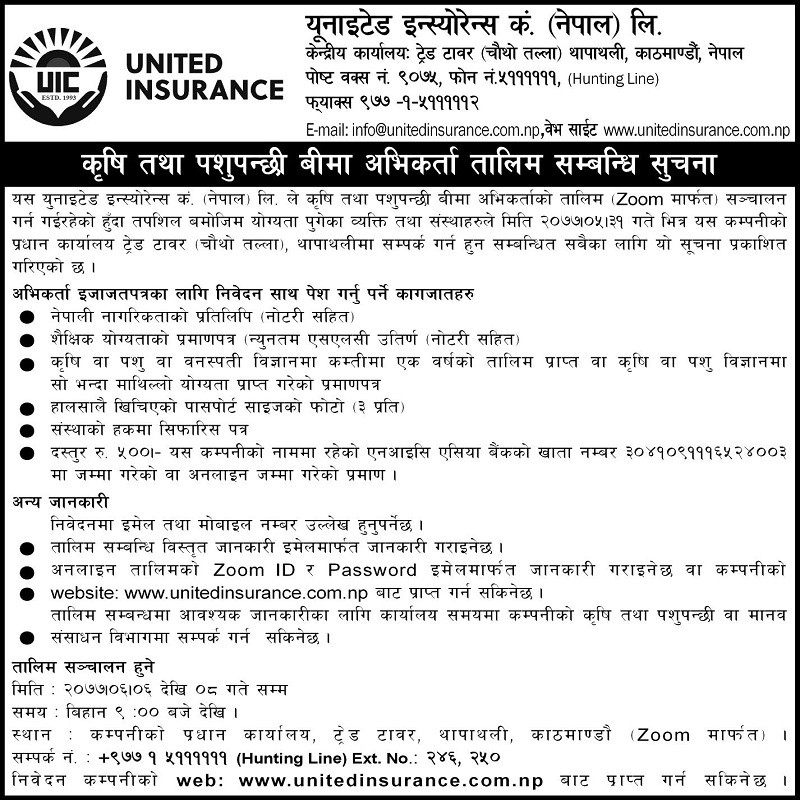 कोरोनाको अवस्थालाई मध्यनजर गर्दै कम्पनीले जुम मार्फत ३ दिन तालिम संचालन गर्ने भएको होे । उक्त तालिममा सहभागी हुन न्यूनतम योग्यता एलएलसी उर्तिण र कृषि, पशु वा बनस्पती विज्ञानमा कम्तीमा एक बर्षको तालिम प्राप्त अभिकर्ताले आवेदन दिनसक्ने छन् ।