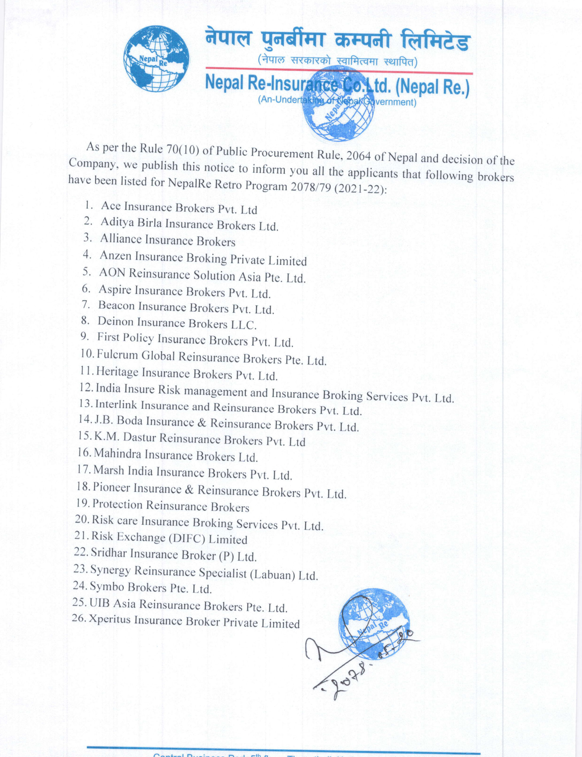 नेपाल पुनर्बीमा कम्पनीद्वारा ब्रोकरको नामावली सार्वजनिक, भारत, सिंगापुर, दुबईका बहुराष्ट्रिय कम्पनी जोडिए