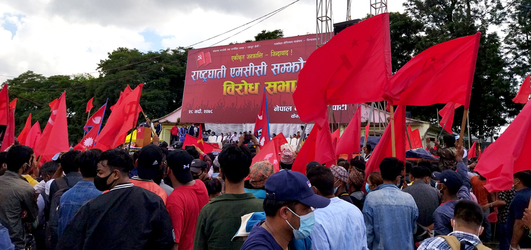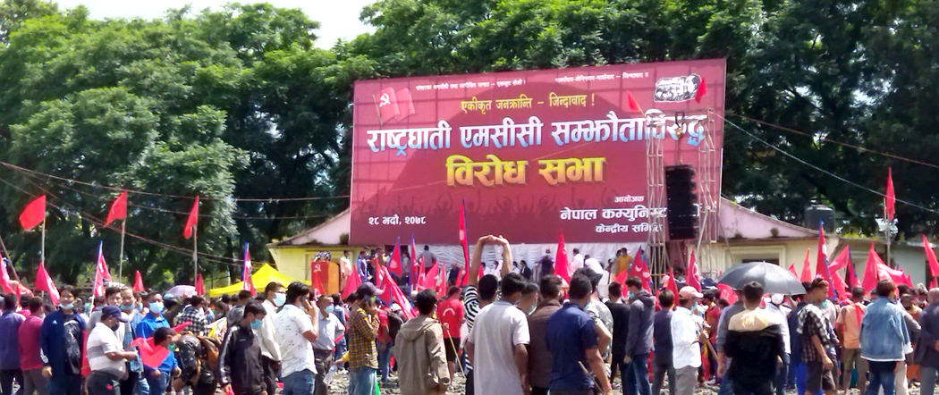 झण्डै सात वर्षपछि खुलामञ्चमा पहिलो राजनीतिक कार्यक्रम गर्दै आयोजित विरोध सभालाई सम्बोधन गर्दै नेकपा मालेका महासचिव सीपी मैनालीले एमसीसी पारित गर्नुपर्छ भन्नेहरू र यो सम्झौता गर्नेहरू घुच्चुकमा आँखा भएकाहरू भएको बताए । अमेरिकाले नेपालमा एमसीसीमार्फत आफ्नो सैन्य परियोजना लागू गर्न खोजेको भन्दै यो राष्ट्रघाती भएको बताए ।