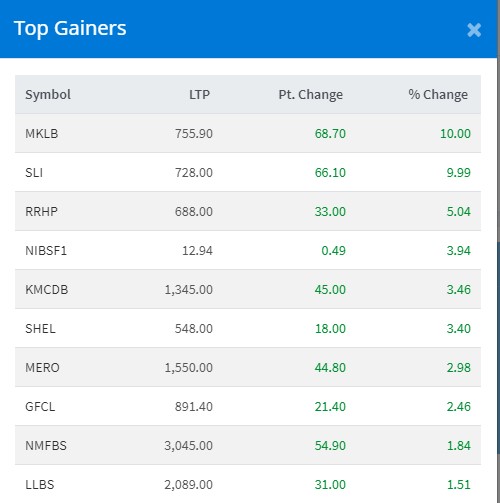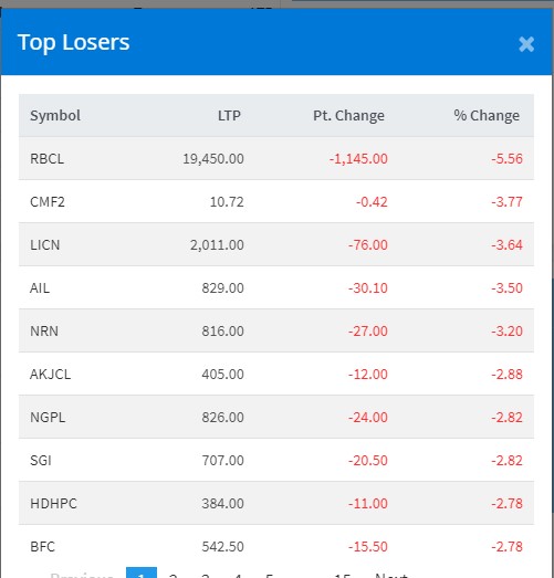 त्यस्तै, गुमाउने कम्पनीहरुमा राष्ट्रिय बीमा कम्पनीको ५.५६ प्रतिशत अकं, सिटिजन म्युचुअल फण्डको ३.७७ प्रतिशत अकं, लाइफ इन्स्योरेन्सको ३.६४ प्रतिशत अकं र अजोड इन्स्योरेन्सको ३.५० प्रतिशत अकंले घटेको हो ।