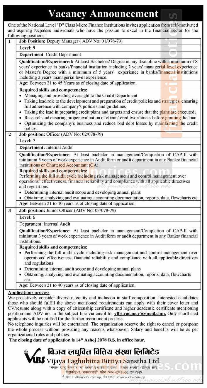 कम्पनीले क्रेडिट डिर्पाटमेन्ट अन्तर्गत डेपुटी म्यानेजर र इन्टरनेट अडिट विभाग अन्तर्गत अफिसर र जुनियर अफिसर माग गरेको छ । जसका लागि स्नातक तह उत्तीर्णसम्मको शैक्षिक योग्यता हुनुपर्ने कम्पनीले जानकारी गराएको छ ।