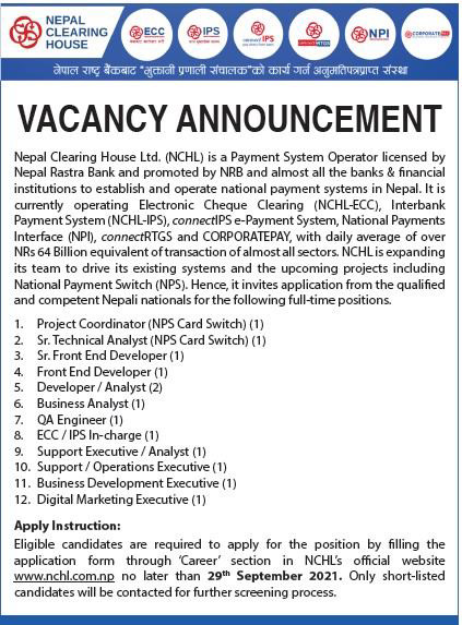 काठमाडौं । नेपाल राष्ट्र बैंकबाट भुक्तानी प्रणाली संचालकको कार्य गर्न अनुमति प्राप्त संस्था ‘नेपाल क्लियरिङ हाउस’ ले कर्मचारी माग गरेको छ । संस्थाले एक सूचना जारी गर्दै विभिन्न पदमा कर्मचारी आवश्यक रहेको जनाएको हो ।