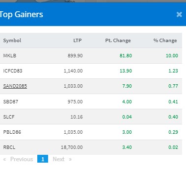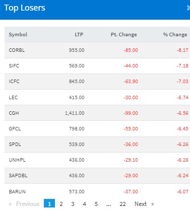 यस्तै, आज गुमाउने कम्पनीहरुमा कर्पोरेट डेभलपमेन्ट बैंकको ८.१७ प्रतिशत अकं, श्री इन्भेष्टमेन्ट फाइनान्सको ७.१८ प्रतिशत अकं, आइसीएफसी फाइनान्सको ७.०३ प्रतिशत अकं, लिबेरी इर्नजीको ६.७४ प्रतिशत अकं र चन्द्रागिरी हिल्सको ६.५६ प्रतिशत अकंले घटेको हो ।