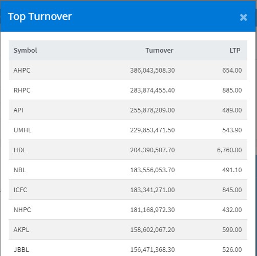 त्यस्तै, रिडि हाइड्रोपावरको २८ करोड ३८ लाख, अपि पावरको २५ करोड ५८ लाख, यूनाइटेड मोदी हाइड्रोपावरको २२ करोड ९८ लाख र हिमालयन डिस्टिलरीको २० करोड ४३ लाख भन्दा माथिको कारोबार भएको छ ।