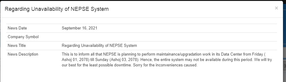 नेप्सेले स्तरोन्ती कार्य गर्न लागेकोले असोज १ गते देखि असोज ३ गतेसम्म सम्पूर्ण सिस्टम नचल्ने जानकारी गराएको हो ।