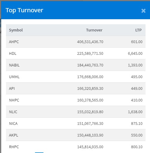त्यस्तै, हिमालयन डिस्टीलरीको २२ करोड ५५ लाख, नबिल बैंकको १८ करोड ४४ लाख, युनाइटेड मोदी हाइड्रोपावरको १७ करोड ६६ लाख र अपि पावर कम्पनीको १६ करोड ६३ लाख भन्दा माथिको कारोबार भएको छ ।