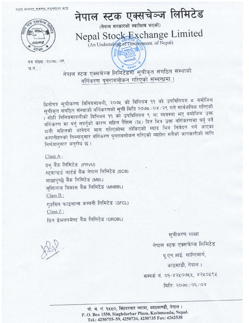 नेप्सेले धितोपत्र सूचीकरण अनुसार गत साउन २९ गते सूचीकृत संगठित संस्थाहरुको वर्गिकरण सार्वजनिक गरेको थियो । तोकिएको म्याद भित्र आवेदन पर्ने आएको उक्त कम्पनीहरुको वर्गिकरण पुनरावलोकन गरी नेप्सेले सूची सार्वजनिक गरेको हो ।