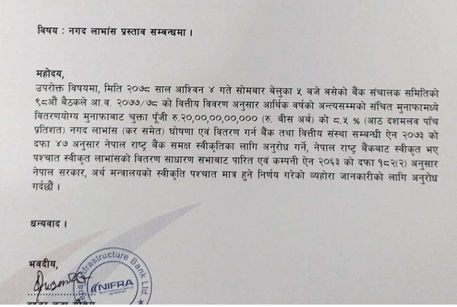 काठमाडौं । नेपाल इन्फ्रास्ट्रकचर बैंक (निफ्रा)ले आफ्ना शेयरधनीहरुलाई ८.५ प्रतिशत लाभांश दिने भएको छ ।