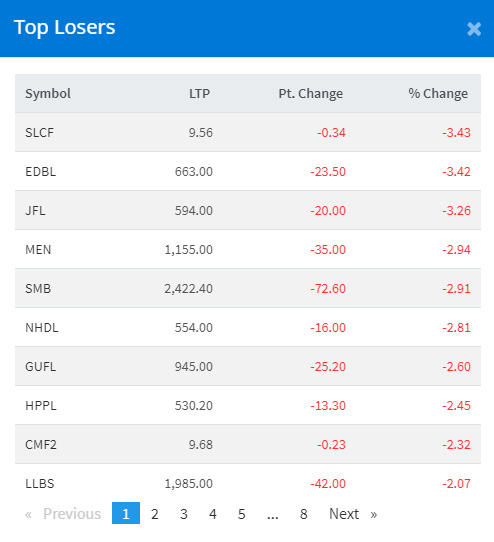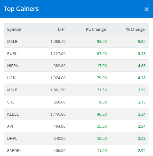 त्यस्तै, आज गुमाउने कम्पनीहरुमा सानिमा लार्ज क्याप फण्डको ३.४३ प्रतिशत अकं, एक्सल डेभलपमेन्ट बैंकको ३.४२ प्रतिशत अकं, जानकी फाइनान्सको ३.२६ प्रतिशत अकं, माउन्टेन इर्नजी नेपालको २.९४ प्रतिशत अकं र सपोर्ट माईक्रोफाइनान्सको २.९१ प्रतिशत अकंले घटेको हो ।