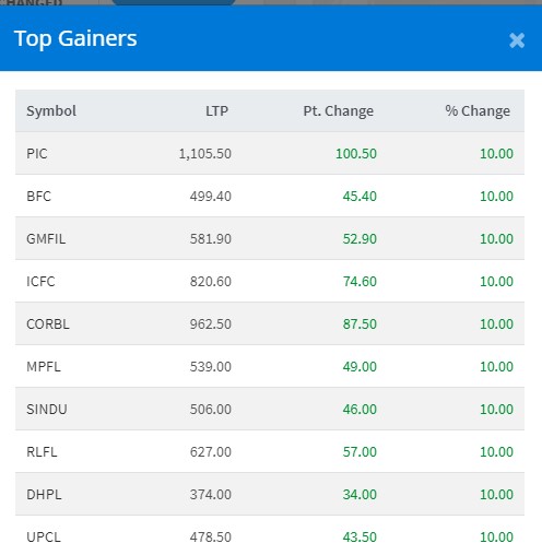 आज प्रिमियर इन्स्योरेन्स, बेस्ट फाइनान्स, गुहेश्वरी मर्चेन्ट बैंक, आईसीएफसी फाइनान्स, कर्पोरेट डेभलपमेन्ट बैंक, मल्टीप्रपोज फाइनान्स, सिन्धु विकास बैैंक, रिलायन्स फाइनान्स, दिब्यशोवरी हाईड्रोपावर, यूनिर्भसल पावर, यूनियन हाईड्रोपावर, हिमाल दोलाखा हाइड्रोपावर र लिबर्टी इर्नजी कम्पनी लिमिटेडको शेयरमा सकारात्मक सर्किट लागेको छ ।