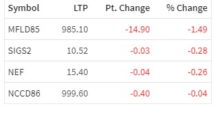 आज २ फण्ड र २ ऋणपत्रको शेयर र इकाई मात्र घटेको छ । मन्जुश्री फाइनान्स ऋणपत्रको १.४९ प्रतिशत अकं, सिद्धार्थ इन्भेष्टमेन्ट ग्रोथको ०.२८ प्रतिशत अकं, नबिल इक्वाटी फण्डको ०.२६ प्रतिशत अकं र एनसीसी डिबेञ्चरको ०.०४ प्रतिशत अकंले घटेको हो ।