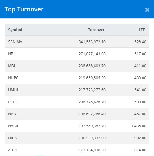 नेप्सेमा झिनो अंकको बृद्धि हुूँदा सर्वाधिक कारोबार गर्ने कम्पनीमा सानिमा बैंक रहेको छ । बैंकले लाभांश घोषणा गरेसँगै आज सर्वाधिक ३४ करोड १५ लाख ८३ हजार ९७२ रुपैयाँको कारोबार भएको छ ।