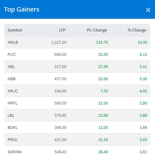 त्यस्तै, प्राइम लाईफ इन्स्योरेन्सको ६.१३ प्रतिशत अकं, नेपाल बैंकको ५.५१ प्रतिशत अकं, नेपाल बङलादेश बैंकको ५.३० प्रतिशत अकं र मैलङु खोला जलविद्युतको ४.०२ प्रतिशत अकंले बढेको हो ।