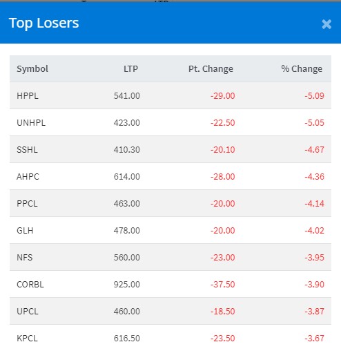 त्यस्तै, आज गुमाउने कम्पनीहरुमा हिमालयन पावर पार्टनरको ५.०९ प्रतिशत अकं, यूनियन हाईड्रोेपावरको ५.०५ प्रतिशत अकं, शिवश्री हाईड्रोपावरको ४.६७ प्रतिशत अकं, अरुण भ्याली हाईड्रोपावरको ४.३६ प्रतिशत अकं र पाँचथर पावरको ४.१४ प्रतिशत अकंले घटेको हो ।