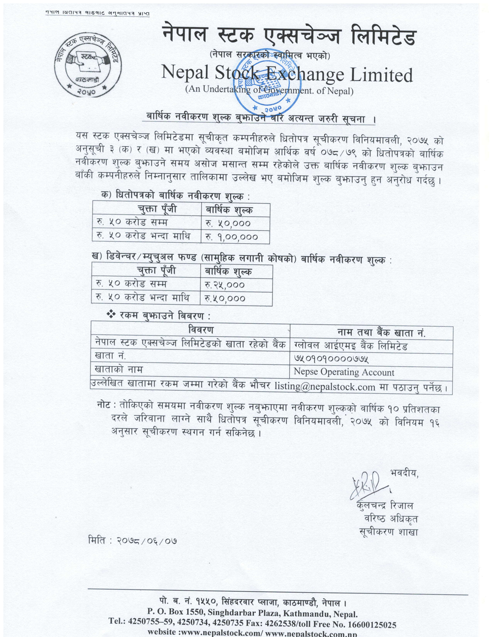 नेप्सेमा सूचीकृत कम्पनीहरुले धितोपत्र सूचीकरण विनियमावली, २०७५ को अनुसूची ३ (क) र (ख) भएको व्यवस्था अनुसार आर्थिक वर्ष २०७८।०७९ को धितोपत्रको बार्षिक नविकरण शुल्क बुझाउन नेप्सेले अनुरोध गरेको हो ।