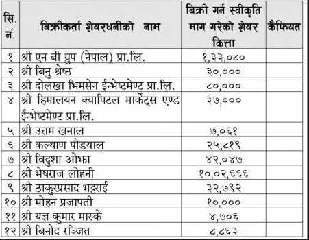 शेयरधनीहरुको नाम र बिक्री संख्या ः
