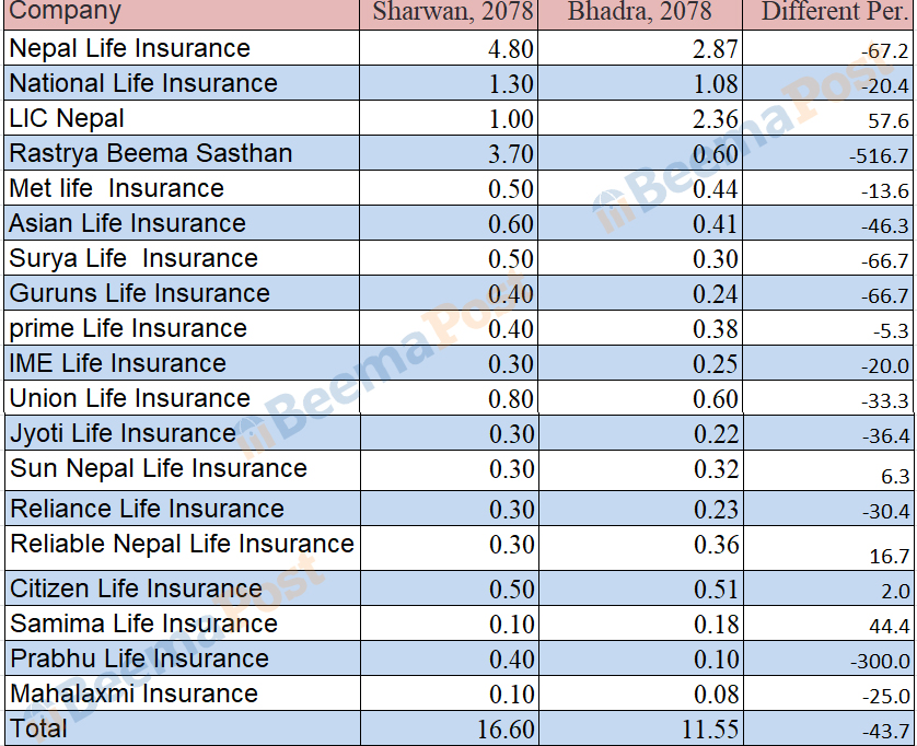 तथ्याङ्क अनुसार जीवन बीमा कम्पनीहरुको बीमा व्यवसाय दुई महिनाको अवधिमा घटेको छ । साउन महिनाको तुलनामा कम्पनीहरुको बीमाशुल्क आर्जन ४३ दशमलव ७ प्रतिशतले घटेको बीमा समितिले उपलब्ध गराएको तथ्याङ्कले देखाएको छ ।