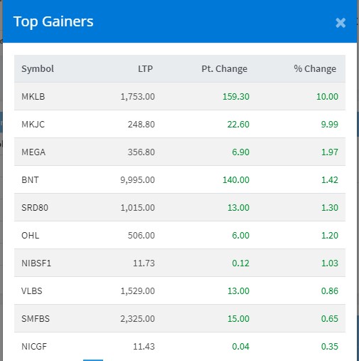 आज मनकामना स्मार्ट लघुवित्त र मैलङु खोला जलविद्युतको शेयरमा सर्किट लागेको छ । साथै, मेगा बैंक नेपालको १.९७ प्रतिशत अकं, बोटलर्स नेपालको १.४२ प्रतिशत अकं र सनराइज डिबेञ्चरको १.३० प्रतिशत अकंले वृद्धि भएको छ ।
