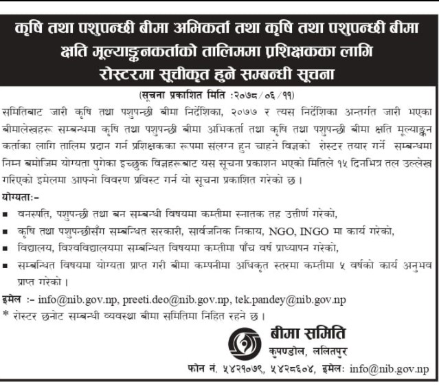 बीमा समितिद्धारा कृषि तथा पशुपन्छी बीमा अभिकर्ता तालिमका लागि प्रशिक्षक माग, कहिलेसम्म दिने आवेदन?