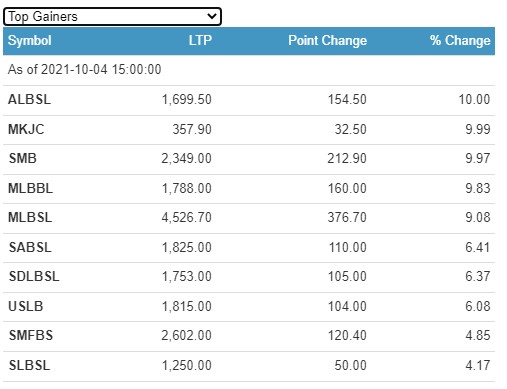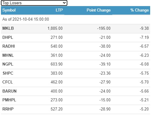 त्यस्तै, सोमबार गुमाउने कम्पनीहरुमा मनकामना स्मार्ट लघुवित्तको ९.३८ प्रतिशत अकं, दिब्यशोवरी हाईड्रोपावरको ७.१९ प्रतिशत अकं, राधी विद्युतको ६.५७ प्रतिशत अकं, माउन्टेन हाईड्रो नेपालको ६.२३ प्रतिशत अकं र न्यादी गु्रप पावरको ६.०८ प्रतिशत अकंले घटेको होे ।