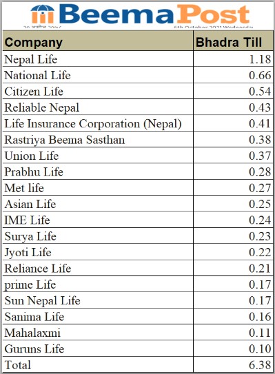 भदौ मसान्तसम्ममा १९ जीवन बीमा कम्पनीहरुको साढे ६ अर्बमाथि प्रथम बीमाशुल्क आर्जन, कुन कम्पनीको कति ?
