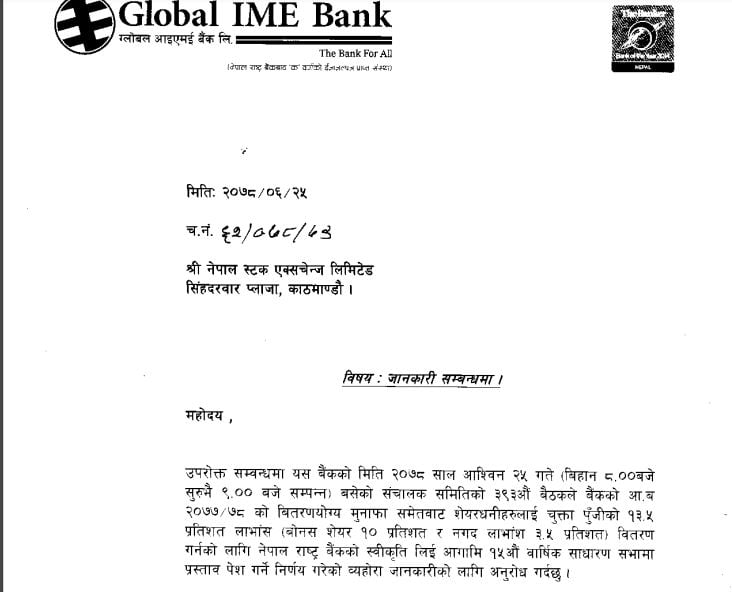 ग्लोबल आइएमई बैंकद्धारा लाभांश घोषणा, बोनस र नगद कति ?