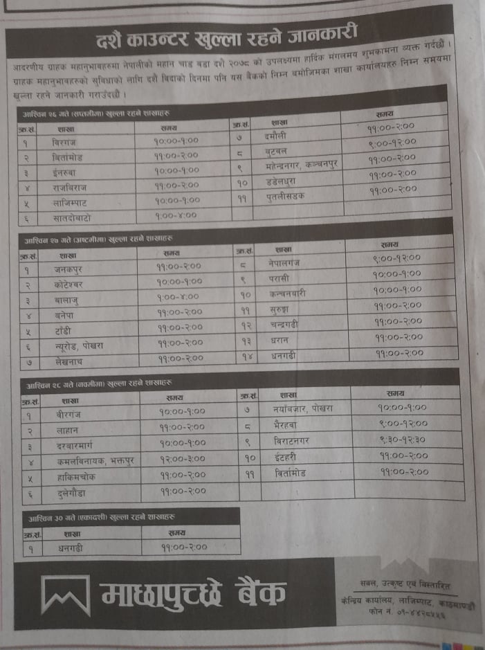 बैंकले असोज २६ गते काठमाण्डौसहित विभिन्न स्थानमा ११ वटा शाखामा दसैँ काउन्टर सञ्चालन गर्नेछ।