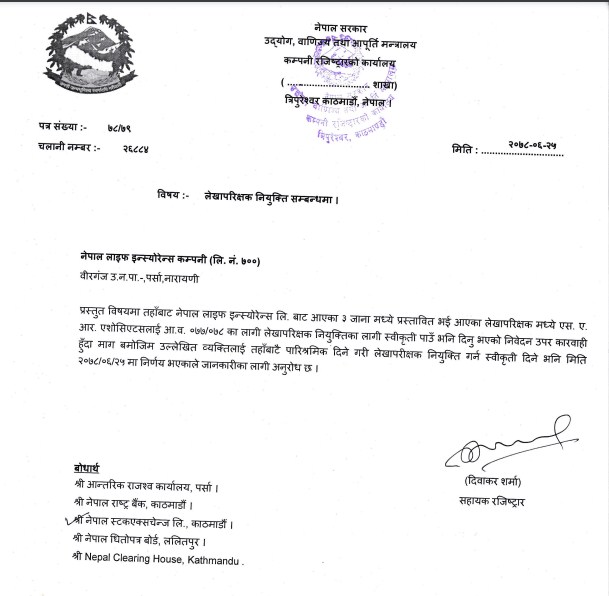 कम्पनी रजिष्ट्रारको कार्यालय, त्रिपुरेश्वरले नेपाल लाइफ इन्स्योरेन्स कम्पनीको अडिट गर्न काठमाडौंको विशाल नगरमा रहेको एस ए आर नामक फर्मलाई स्वीकृत प्रदान गरेको जनाएको छ ।
