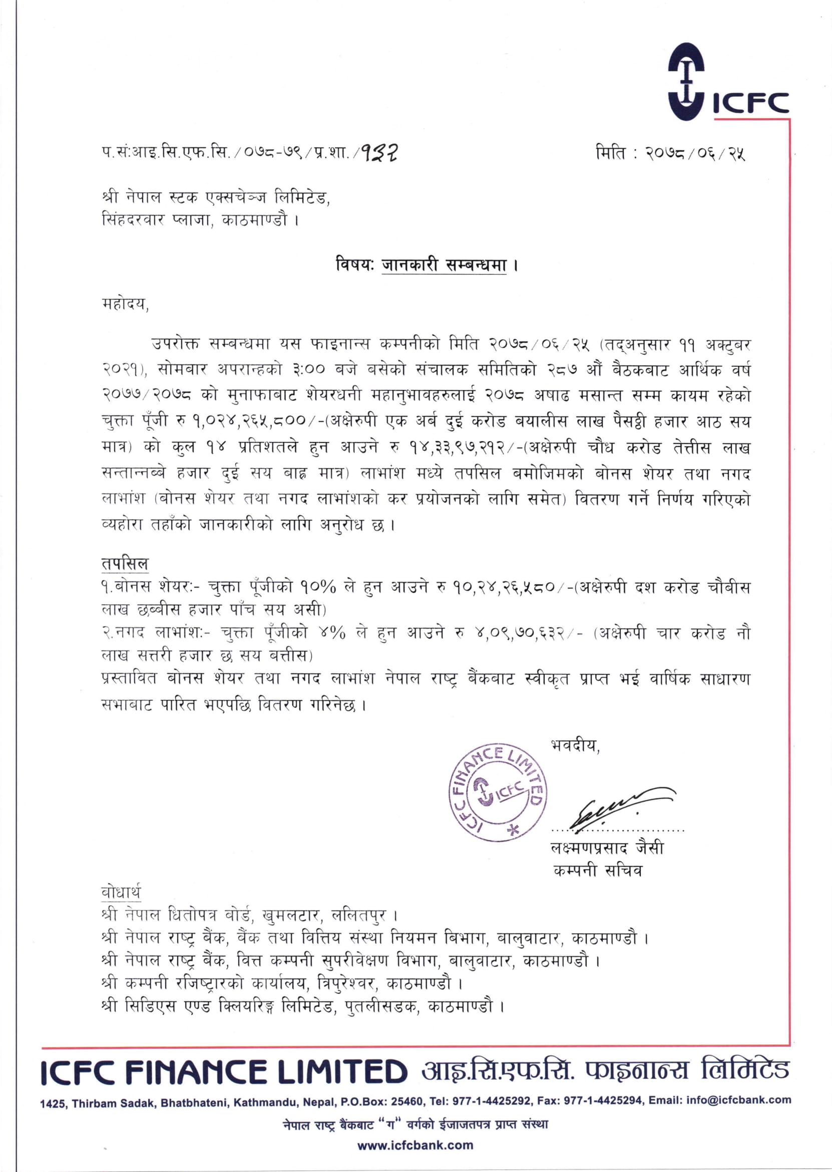 आइसिएफसी फाइनान्सद्धारा लाभांश घोषणा, बोनस र नगद कति ?