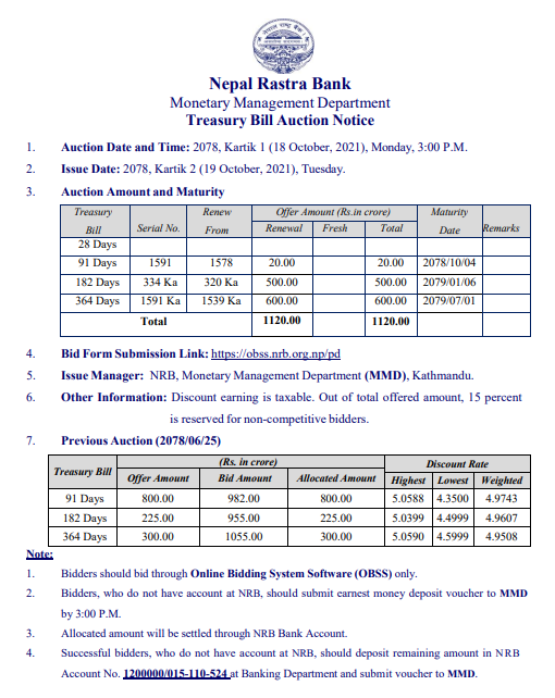 काठमाडौं । नेपाल राष्ट्र बैंकले ट्रेजरी बिल बिक्री गर्ने भएको छ । बैंकले ११ अर्ब २० करोड रुपैयाँको ट्रेजरी बिल बिक्री गर्ने भएको हो ।सरकारलाई आवश्यक अल्पकालीन ऋण उठाउन बोलकबोल प्रक्रिया मार्फत ट्रेजरी बिल आजदेखि बिक्री गर्न लागिएको हो । राष्ट्र बैंकले ९१ दिन अवधिको २० करोड, १८२ दिनको ५ अर्ब र ३६४ दिनका लागि ६ अर्ब गरी कुल ११ अर्ब २० करोड रुपैयाँ बराबरको ट्रेजरी बिल जारी गर्न लागेको केन्द्रीय बैंकले जनाएको छ ।