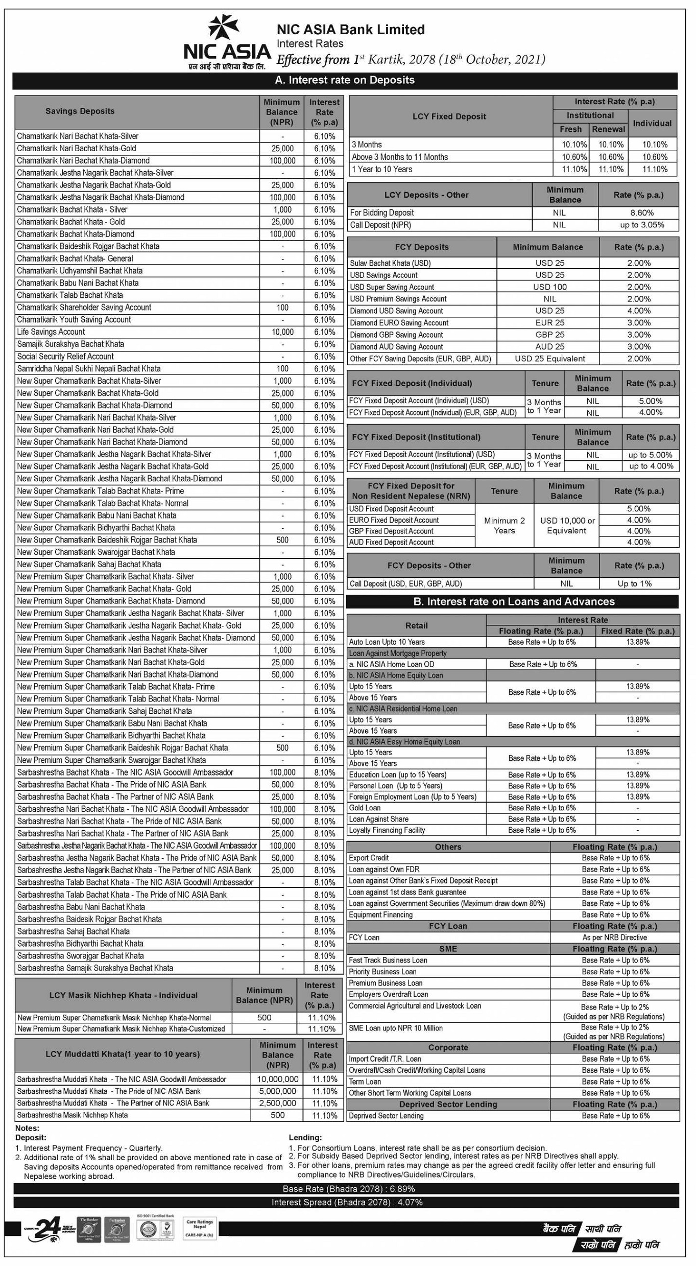 एनआईसी एशिया बैंकले सार्वजनिक गर्यो नयाँ व्याजदर, अधिकतम ११.१० प्रतिशतसम्म ब्याजदर निधारण