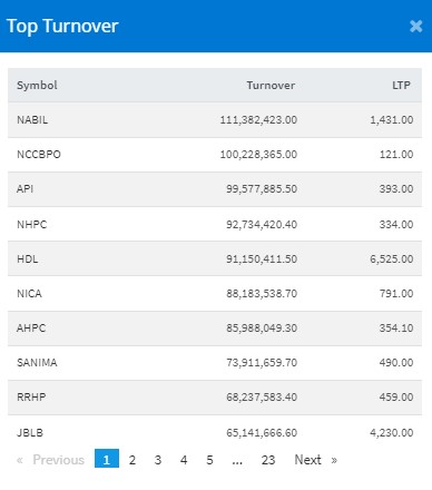 नबिल बैंकको आज ११ करोड माथिको शेयर कारोबार भएको छ भने एनसीसी बैंकको प्रमोटर शेयरको १० करोड माथिको शेयर कारोबार भएको छ।त्यस्तै , अपी पावर, नेशनल हाईड्रोपावर, हिमालयन डिस्टीलरी, एनआईसी एशिया बैंक, अरुण भ्याली, सानिमा बैंक, रैराङ र जीवन विकास लघुवित्तको सर्वाधिक कारोबार भएको छ।
